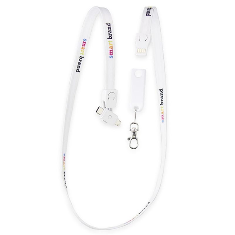 3in1 smartphone charging cable for Micro-USB, Lightning and TypeC as lanyard incl. wrap-around logo printing up to 4C