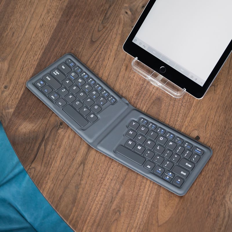 Foldable Bluetooth keyboard in a stable case for smartphone, tablet and desktop devices